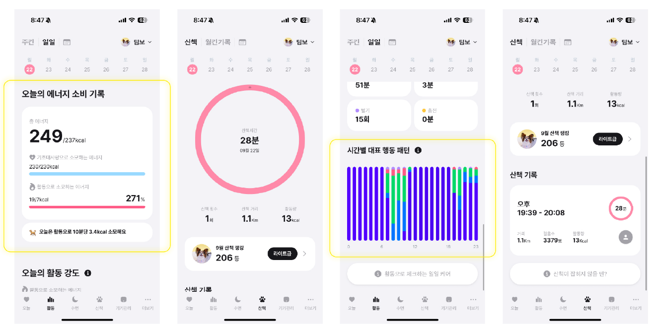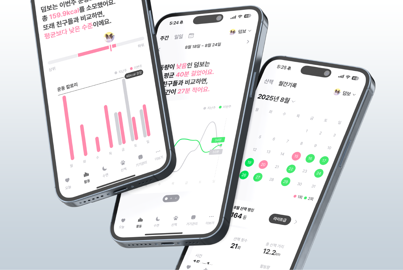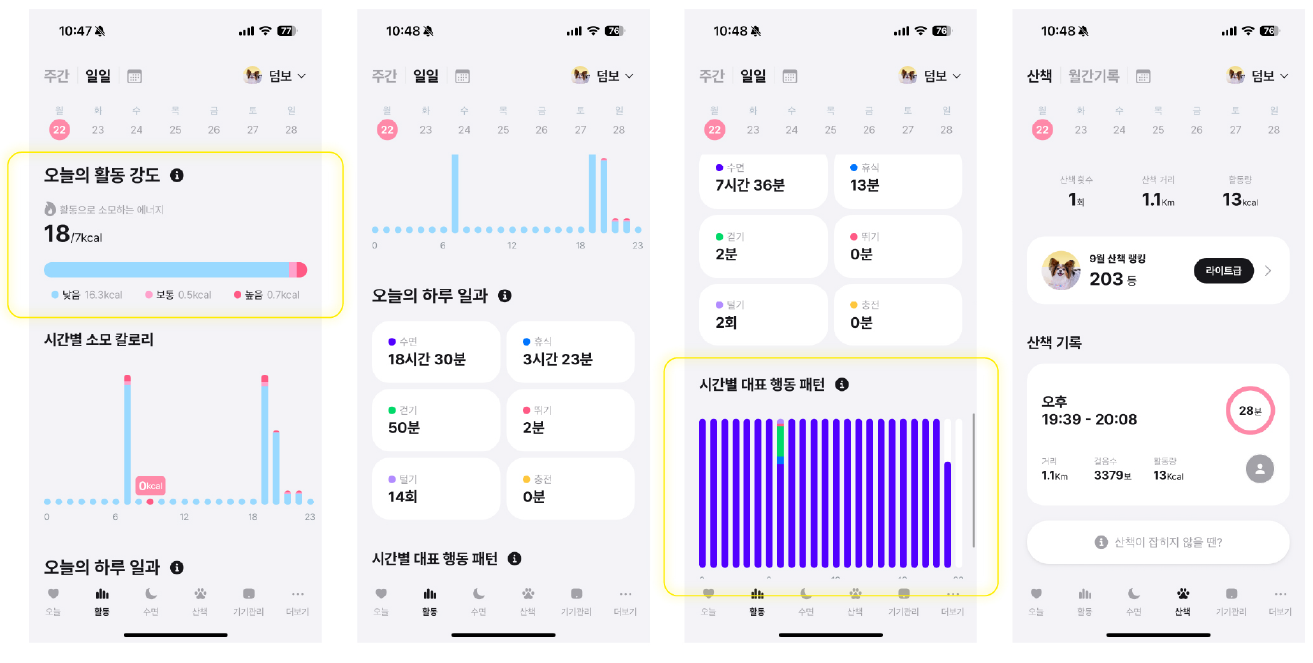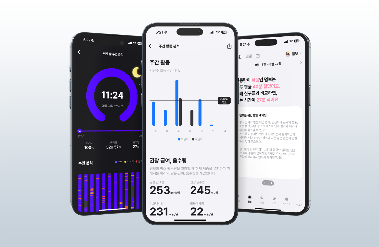 엄격한 다이어트 관리보단 전반적인 컨디션 체크에 딱이야! 주간, 월간 리포트로 활동량 변화를 한눈에 볼 수 있거든. 특히 밤새 얼마나 뒤척였는지 수면의 질까지 알려줘서, 눈에 보이지 않는 덤보의 컨디션 변화를 감지하는 데 큰 도움이 됐어.